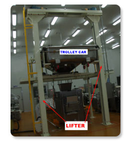Lifting, tilting the trolley-car to pour the dough into mixer unit. After cutting the dough, it supplied to divider.